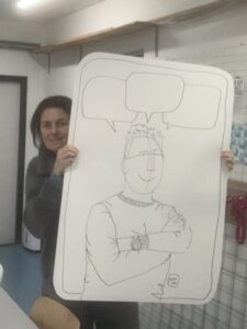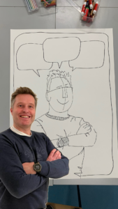 Als we bellen, vraagt hij of ik ook een kaart kan uitprinten zonder tekst in de spraakballon. Natuurlijk is dit mogelijk, de kaarten heb ik zo gemaakt dat deze tekst op een losse laag staat. Maar direct schiet mijn creatieve brein in actie: wat nou als je een foto opstuurt, dan teken ik jou op een kaart met een paar lege spraakballonnen.