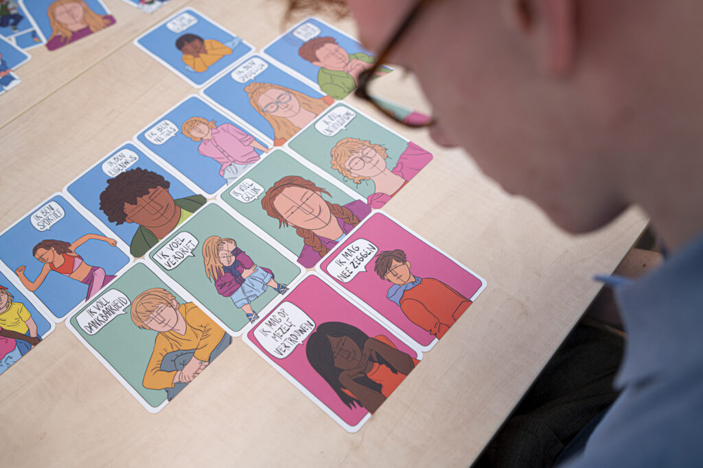 Wanneer er een aantal superkrachten, twee tot vier kaarten is overzichtelijk, dan kan er gesproken over gevoelens. Hoe voel je je? Er zijn vijf positieve en vijf negatieve groene gevoelskaarten. Onderzoek samen hoe het kind zich nu voelt, en vraag door waarom hij/zij zich zo voelt.