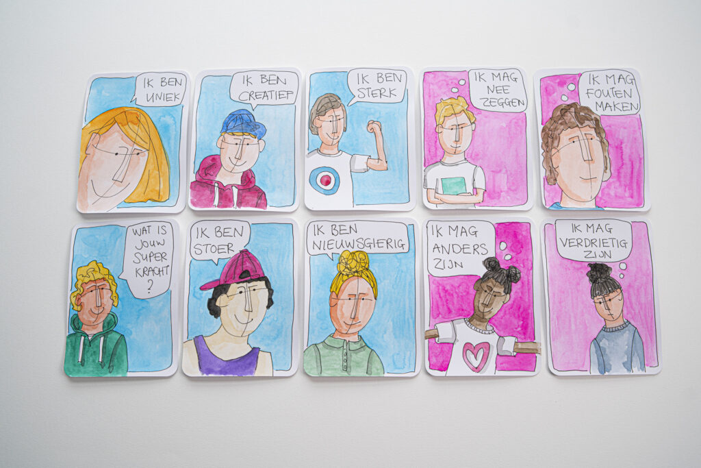 Als eindproject voor de Illustratie Expeditie maakte ik de eerste aanzet voor een carddeck om kinderen te coachen. De kennis die ik tijdens deze reis naar mezelf heb opgedaan, wil ik inzetten om kinderen hun eigen krachten te ontdekken en laten gebruiken.